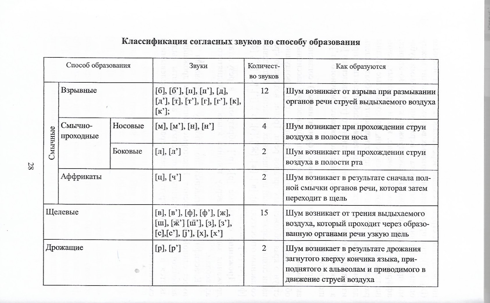 3. Systém souhlásek ruského jazyka. Klasifikace dle místa a způsobu vzniku. Redukce.